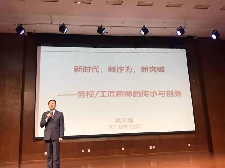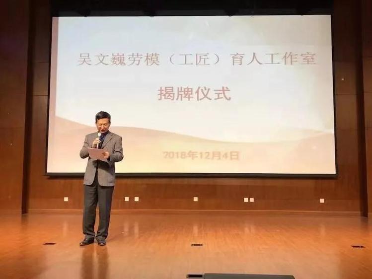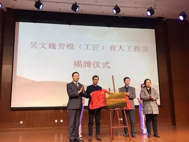 会上,罗宁、张捷、赵欣与吴文巍一同为工作室揭牌  揭牌仪式之后,吴文巍受邀作工作室主题讲座“新时代,新作为,新突破——劳模工匠精神的传承与创新”。他以服务进博会的网信工作为切入点,旁征博引,为讲述了在信息时代下作为一名高职学生该如何培养自己的“工匠精神”。吴文巍指出,新时代下,信息不断更迭,信息技术进步推动时代进步。未来已来。正是信息技术迸发的强大动力让我们的生活产生新的联接,为智慧上海添砖加瓦。而这些智能应用的背后,是信息行业从业者的巨大努力,技术变革的背后更有人情的温度。吴文巍感慨:技术是中性的,技术被赋予了关爱和公平、责任和担当后,才有了温度,变得温情脉脉。在讲座的最后,他与同学们分享了他在工作经历中坚持的24字人生真谛——爱岗敬业、争创一流、艰苦奋斗、勇于创新、淡泊名利、甘于奉献。党的十九大指出要进一步弘扬劳模精神和工匠精神。“劳模(工匠)育人工作室”是学习、宣传、传承、弘扬劳模精神的有效载体。前期,我校护理与健康学院已建立了“蔡蕴敏劳模(工匠)工作室”,让学生们可以在劳模身边学习,近距离感受到了劳模的魅力,激发了学习劳模的热情。此次,吴文巍劳模(工匠)工作室,由护理与健康学院、创业学院、信息与机电学院共建。 学校将继续以劳模(工匠)工作室建设为基础,开展劳模(工匠)精神校园巡讲为抓手,营造“劳模工匠”精神育人的校园新文化,提高大学生的思想道德素质、专业素质、文化素质和身心素质,发挥劳模工匠引领作用,根植劳模工匠精神。通过青年学生群体的带动,在全社会营造尊重劳动、尊重知识、尊重人才、尊重创造的良好范围。 吴文巍个人事迹 吴文巍,中共党员,全国五一劳动奖章获得者,享国务院特殊津贴。获上海市劳模、上海市技术能手、全国用户满意服务明星荣誉称号。中国电信上海公司首席服务专家、上海市人民监督员、上海物联网联合实验室特聘专家,2017年入围上海市“智慧工匠”,获上海市优秀志愿者称号。还受聘成立上海市首批劳模创新工作室(2011年),上海市首席技师工作室(2014年)。他带领的团队获得上海市劳模集体、国务院国资委优秀集体、工人先锋号、世博卓越服务团队、全国用户满意服务明星单位等全国和省部级荣誉。