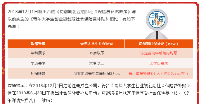 2018年12月1日新出台的《初创期创业组织社会保险费补贴政策》与以前实施的《青年大学生创业初创期社会保险费补贴》相比,有如下亮点: