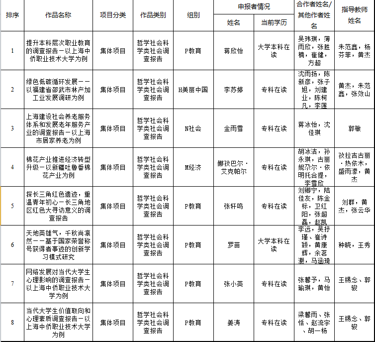 根据《关于组织开展第十七届“挑战杯”上海市大学生课外学术作品竞赛的通知》的要求,秉承公平、公正、公开的原则,在校赛的基础上,经过多方评审,最终根据分数排名,按照以下顺序,拟推在校级决赛获奖的8支项目团队进入上海市“挑战杯”大学生课外学术科技作品竞赛。现将名单公示如下: